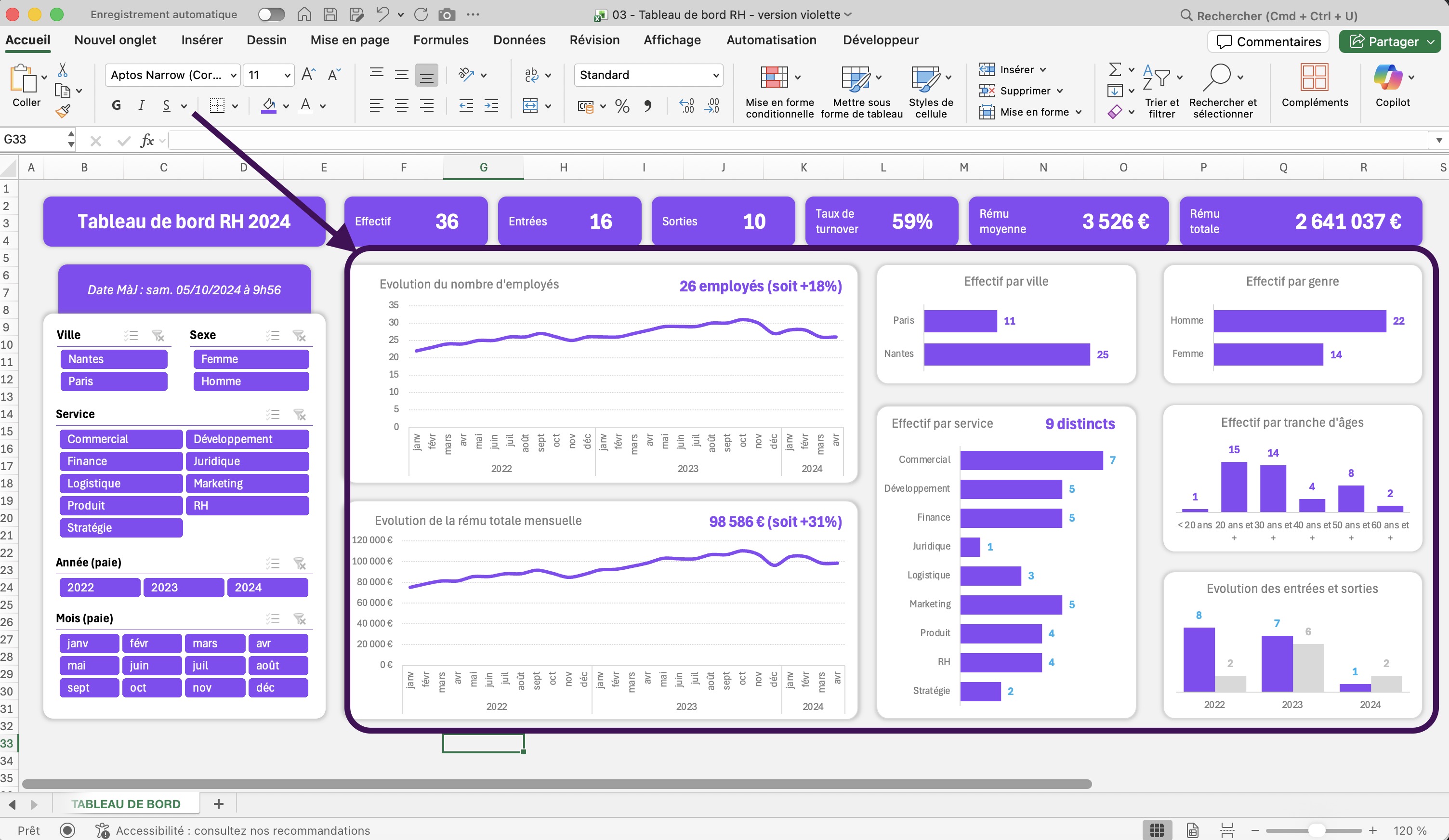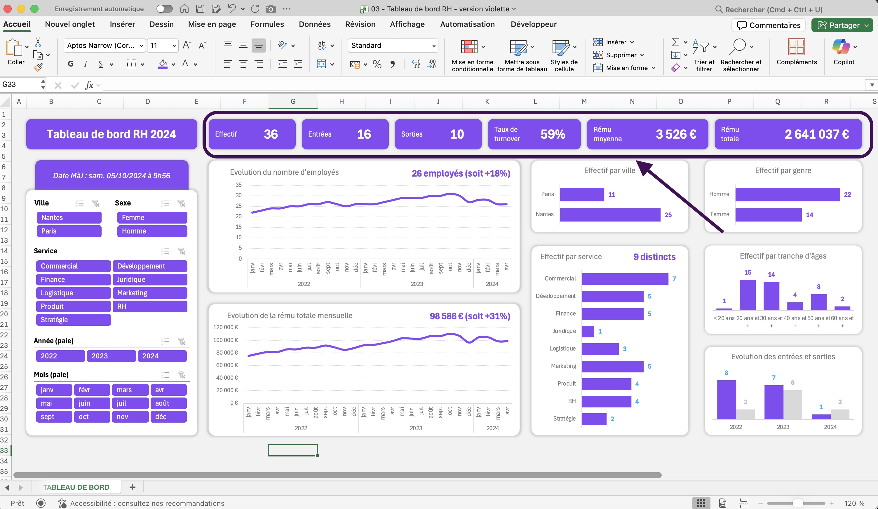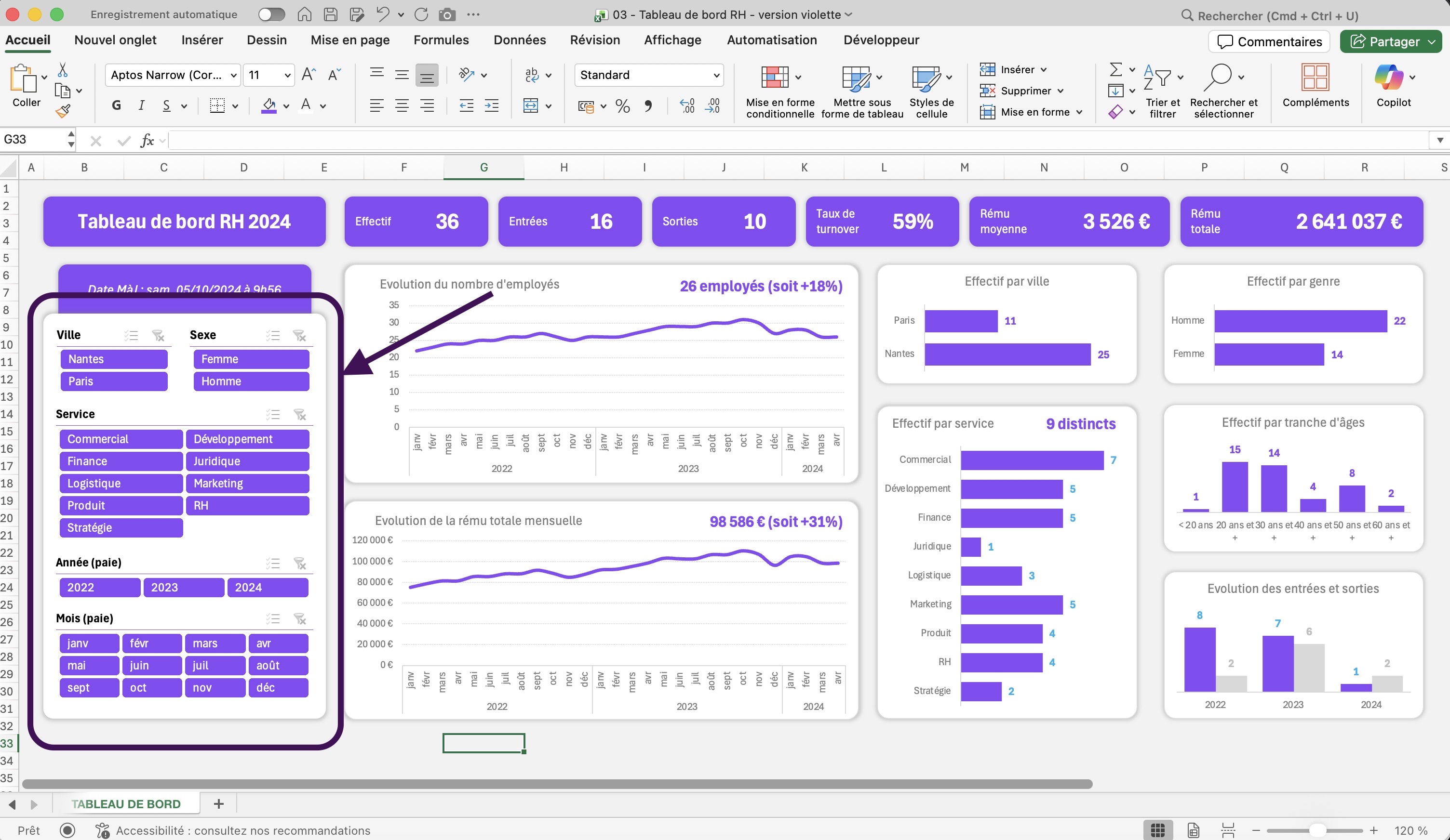 Une fois vos TCD créés, vous pouvez passer à la construction des éléments visuels de votre tableau de bord RH. L’objectif est de rendre toutes les analyses dynamiques et interactives, afin que chaque segment ou filtre mette à jour instantanément les KPI et graphiques.