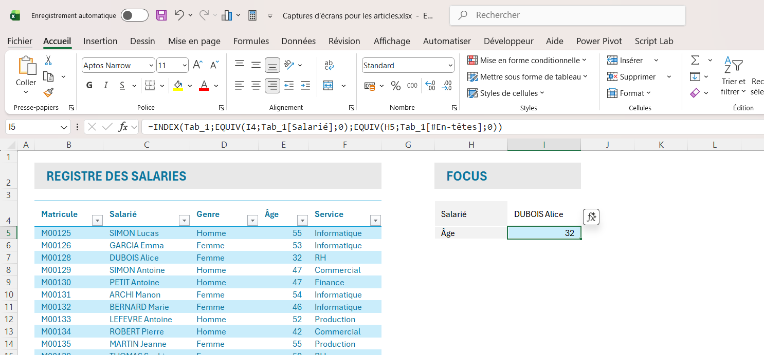 =INDEX( Tab_1 ; EQUIV( "Alice DUBOIS" ; Tab_ [Salarié] ; 0 ) ; EQUIV( H5 ; Tab_1[#En-têtes] ; 0 ) ) = 32